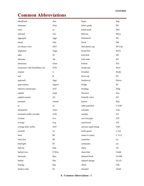 | Title | Appendixe - Abbreviation - Common Abbreviations 12/15/ abandoned Abn abutment Abut acres ac ... |