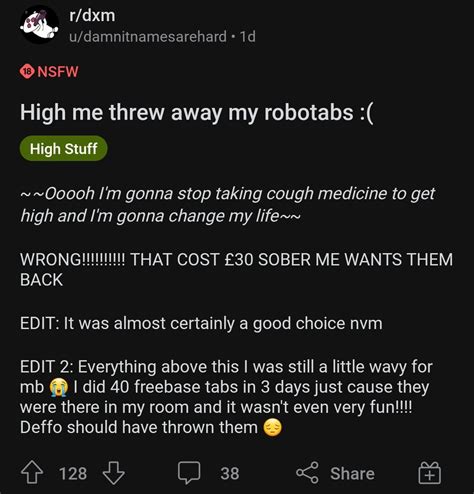 | Title | grrr curse those damn cough suppressants they are ruining my life >:( : r/drugscirclejerk |