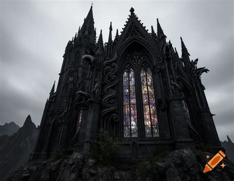 | Title | A dark gothic fortress with ornate architecture and majestic stained glass windows under a bleak ... |