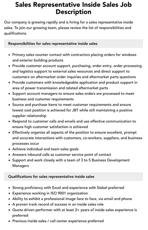 | Title | Inside Sales Representative Job Description |