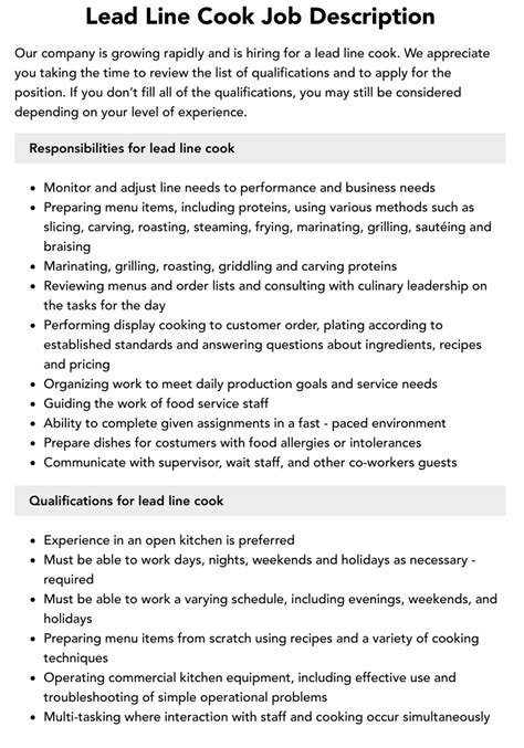 | Title | Lead Line Cook Job Description |