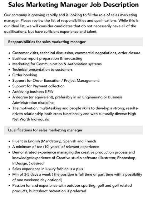 | Title | Sales and Marketing Manager Job Description |