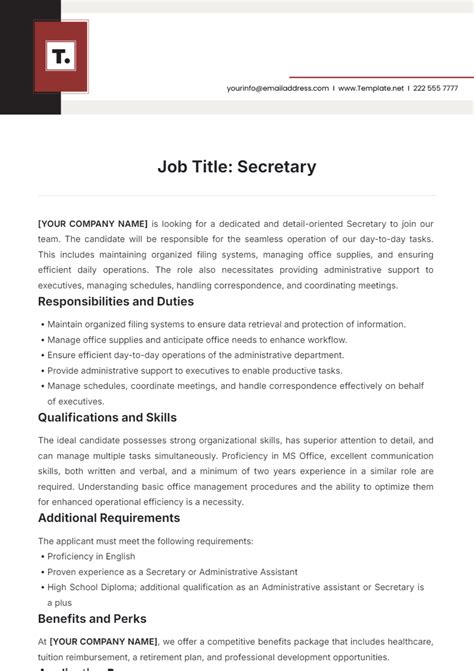 Looking for a comprehensive Secretary Job Desc? Discover the essential roles and responsibilities required for administrative success. This guide breaks down key office management duties, vital organizational skills, and software proficiency needed to excel. Streamline your hiring process or prepare for your next career move with our clear, actionable breakdown of professional secretarial expectations.