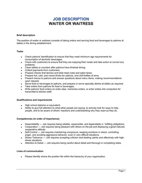 Discover the essential components of a professional Waitress Position Description. Learn how to outline key responsibilities, required customer service skills, and physical demands to attract top-tier candidates. Use our expert template to define job expectations, streamline your hiring process, and find the perfect server to enhance your restaurant's dining experience and guest satisfaction.