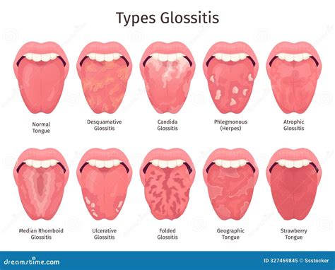 | Title | Glossitis. Scarlet tongue disease types, human mouth sore teeth problem healthy or sick ... |